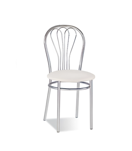 Стул размещается на четырех опорах, которые оснащены пластиковыми заглушками. Высокая спинка имеет скругленные углы. Каркас изготовлен из электросварной трубы.