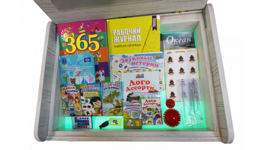 Профессиональный набор логопеда соответствует ФГОС. Комплектующие поставляются в корпусе на прямоугольном основании, с двумя выдвижными ящиками и откидной крышкой. К сундучку прилагаются программы для речевых и творческих занятий.