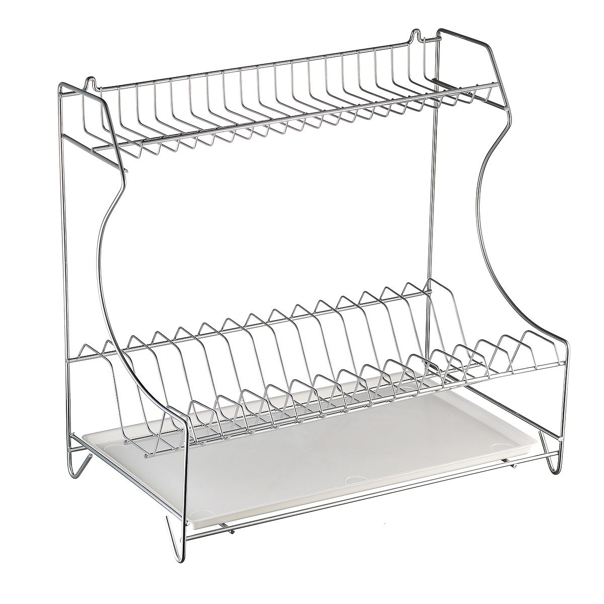 Сушилка для посуды из хромированного металла, может вешаться на стену, а можно разместить ее на столе. Имеет поддон и две секции сушки для большой и маленькой посуды. Рекомендуется для кухонь школ и детских садов.