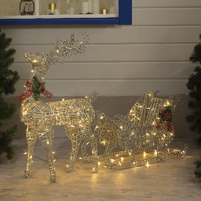 Световая фигура устанавливается на улице перед праздниками. Конструкция сияет теплым белым светом, украшена ленточками и шишками.