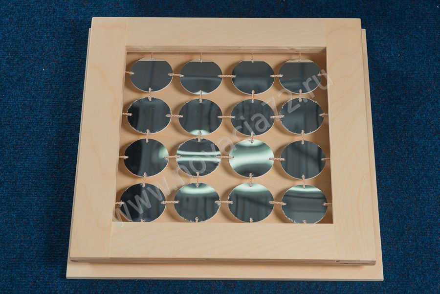 В деревянный корпус с рамой вмонтировано 16 маленьких круглых зеркал. Панель может использоваться для развития навыка фокусировки взгляда, для проведения гимнастики для глаз.