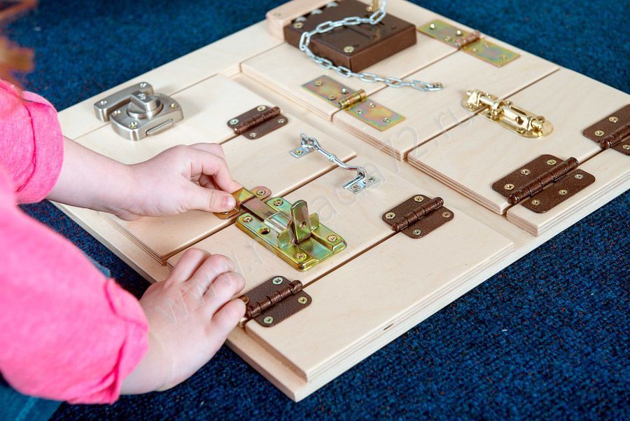 На настенной панели расположены дверцы с несколькими видами щеколд и замков. Способствует тактильному развитию, тренирует мелкую моторику.