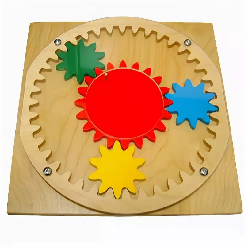На панели расположены разноцветные шестеренки. Развивает ловкость, воображение, координацию движений и мелкую моторику, а также может использоваться в качестве дидактического материала для изучения цветов.