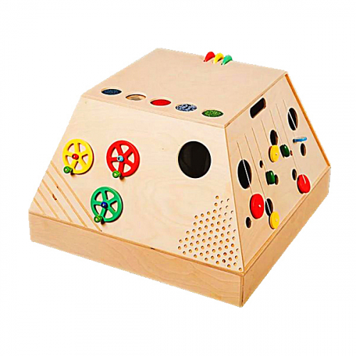Игрушка в форме пирамиды оснащена различными тактильными деталями: шестеренки, ткани разной текстуры и пр. Способствует тактильному развитию и тренирует мелкую моторику.