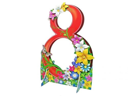 Полноцветная декорация изготовлена в виде цифры 8, украшенной цветами. Предназначена для оформления сцены к праздничным мероприятиям, посвященным празднику 8 марта.