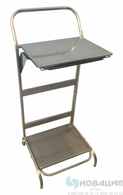 Тележка на каркасе из труб подходит для сбора отходов. Оснащена откидной крышкой и педалью, между которыми закрепляется мешок. Сверху предусмотрена 1 ручка. Под нижней площадкой 2 стационарных упора и 2 колеса, d 75 мм.