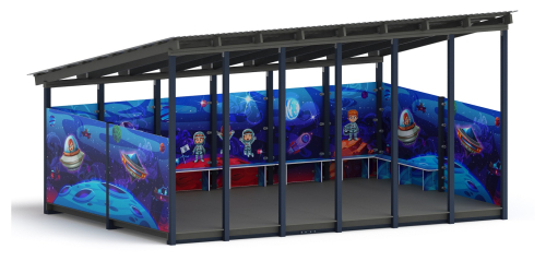 Стены беседки украшены изображениями на космическую тематику. Конструкция монтируется при помощи опор квадратной формы. Беседка оснащена крышей. Пол с антискользящим покрытием.