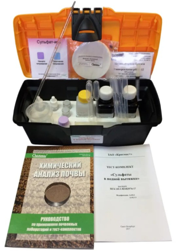 Тест-комплект используется для быстрого определения содержания сульфат-ионов в засоленных почвах при почвенном, агрохимическом и мелиоративном обследовании земель, контроле солевого режима почв и других исследованиях. Комплект содержит все необходимые инструменты, реактивы, посуду и документацию, упакованные в прочный переносной кейс.