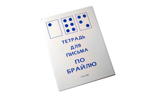 Тетрадь для детей с нарушениями зрения изготовлена из специальной бумаги. В ней пишут символами Брайля. Сзади на обложке приводится рельефно-точечный алфавит с условными обозначениями цифр, математических функций, знаков препинания.