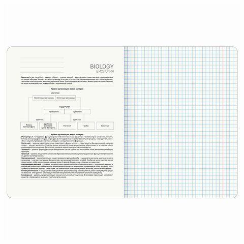 Тетрадь по биологии формата А5 (165х205 мм) содержит 48 листов, изготовленных из высококачественной офсетной бумаги плотностью 60 г/м2 и белизной 100%. Листы соединены скобами. Линовка блока - в клетку, красные поля.