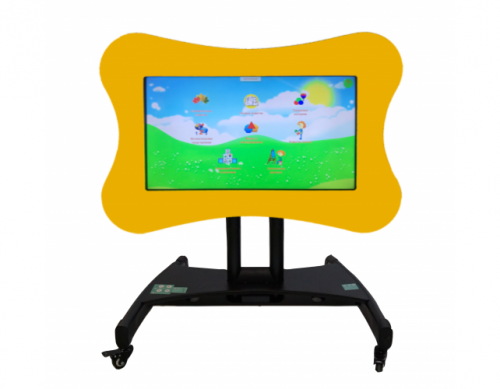 Фигурный корпус закреплен на подвижной подставке с колесами. Наклон и высота регулируется. При необходимости панель превращается в стол. Толщина монитора исключает возможность появления трещин. Углы конструкции закруглены.