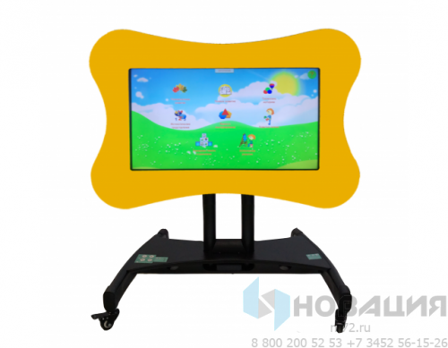 Фигурный корпус закреплен на передвижной подставке с колесами. Наклон и высота регулируется. При необходимости панель превращается в стол. Толщина монитора исключает возможность появления трещин. Углы конструкции закруглены.