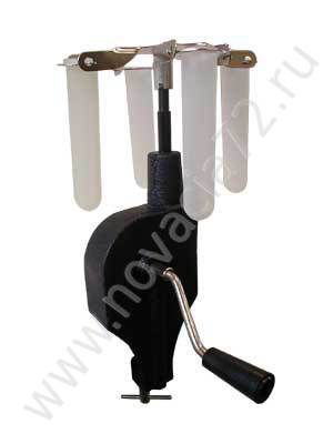 Центрифуга выполнена в виде модели и предназначена для демонстрации принципа устройства и действия простейшей центрифуги. Прибор состоит из крестообразной пластины с вилками на концах. К вилкам подвешены на осях кольца с пластмассовыми полыми цилиндрами для вкладывания в них стеклянных пробирок. Пластина закреплена с помощью втулки на шпинделе центробежной машины. Передача вращательного движения от рукоятки к шпинделю осуществляется посредством червячной передачи. Отношение числа оборотов рукоятки к числу оборотов шпинделя 1:16. Центробежная машина с центрифугой закрепляется на столе с помощью струбцины. Может быть использована для демонстрации ряда опытов, где требуется вращательное движение.