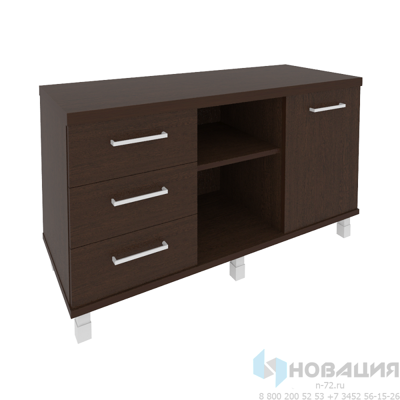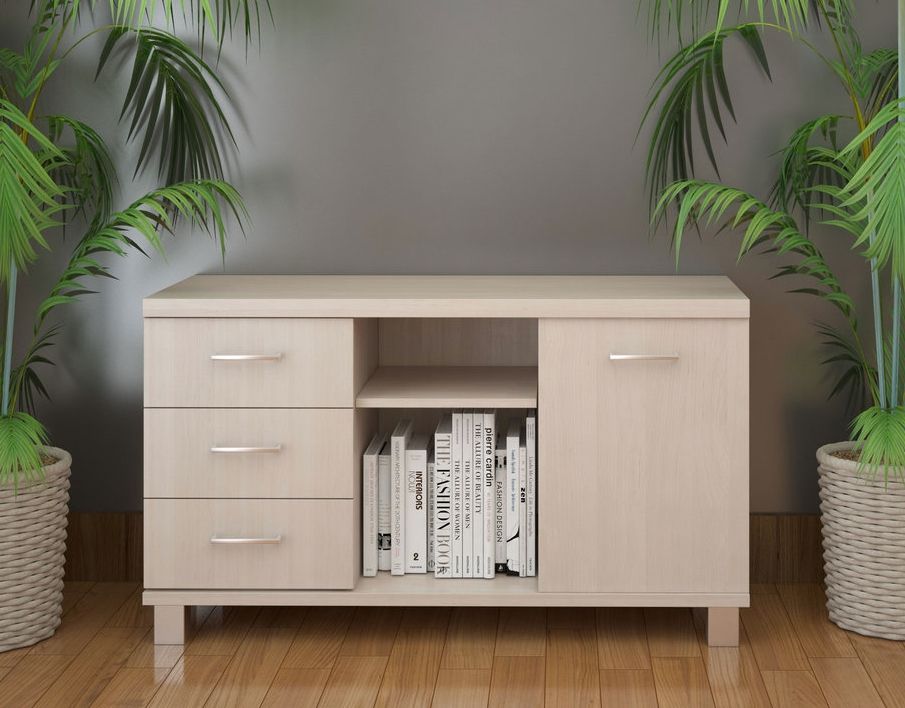 Сервисная тумба представлена 3-мя выдвижными ящиками, 2-мя полуоткрытыми отделениями и распашным фасадом. Стационарная конструкция с прямоугольным топом служит для хранения канцелярии, техники, учебных наборов. Полуоткрытые отделения располагаются друг под другом. Ручки на фасадах ящиков и дверной створке металлические. ЛДСП отделана кромкой (0,4 и 2 мм) в цвет мебели.