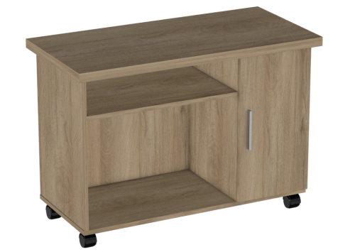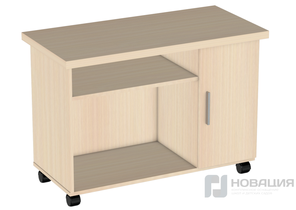 Тумба на колесиках, с дверцей, нишей и открытой верхней полкой размещается в кабинетах ДОУ, школ, прочих муниципальных учреждений. Возможность выбора вариантов цветового решения позволяет вписать данный предмет мебели в любую обстановку.