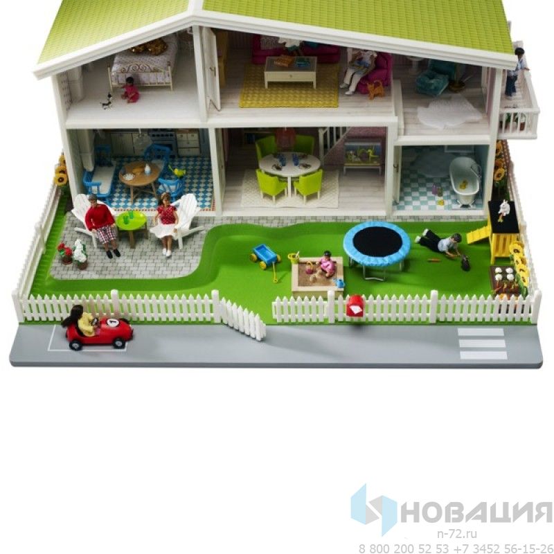 Набор состоит из участка с зелёным покрытием, имитирующим газон, белой ограды и дорожки с парковкой. Участок присоединяется к кукольному домику и привносит разнообразие в сюжетно-ролевые игры.