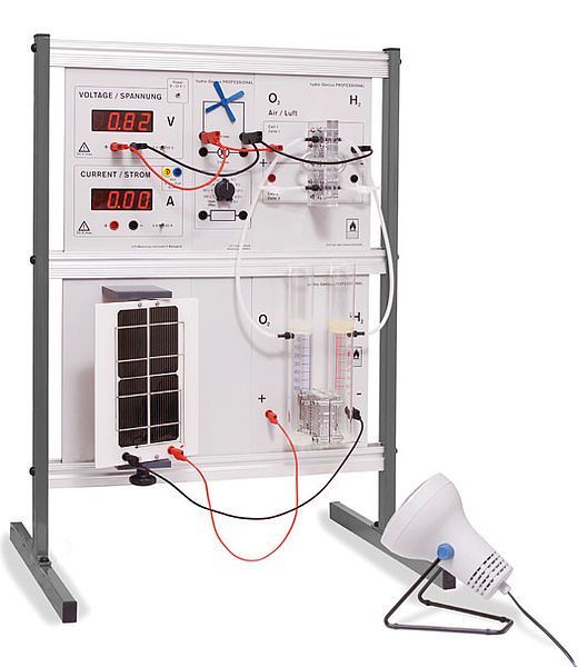 Учебно-методический стенд «Солнечная Энергетика и водородный цикл» представляет собой фотоэлектрическую водородную установку, предназначенную для изучения принципов преобразования света в ток.