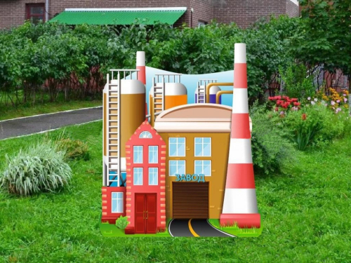 Фигура с полноцветным изображением выполнена в виде здания завода. Поверхность покрыта защитной пленкой. Устанавливается в грунт посредством металлических стоек и крепежа (входят в комплект).