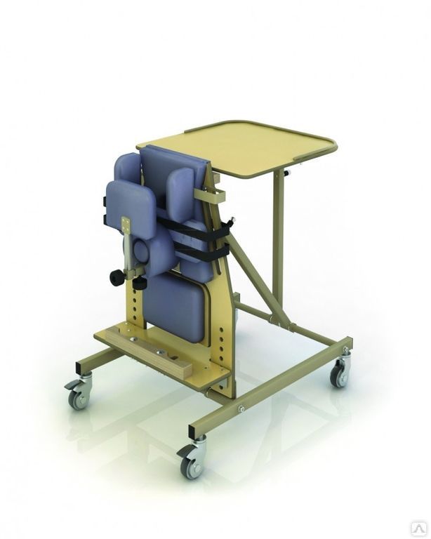 Вертикализатор движется на 4-х колесах из антистатической резины (d 75 мм), 2 из них с индивидуальными тормозами. Каркас изготовлен из стальных труб. Подвижные элементы не ржавеют. Фанера покрыта лаком на водной основе. Крепления устойчивы к истиранию, их можно дезинфицировать. Подножка переставляется на нужную высоту.