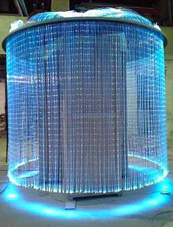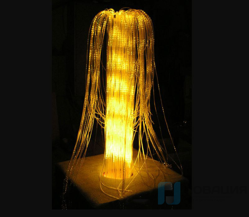 Фибероптическое волокно с боковым свечением струится вдоль прозрачной трубы высотой 1 м, которая устанавливается на мягкую тумбу.