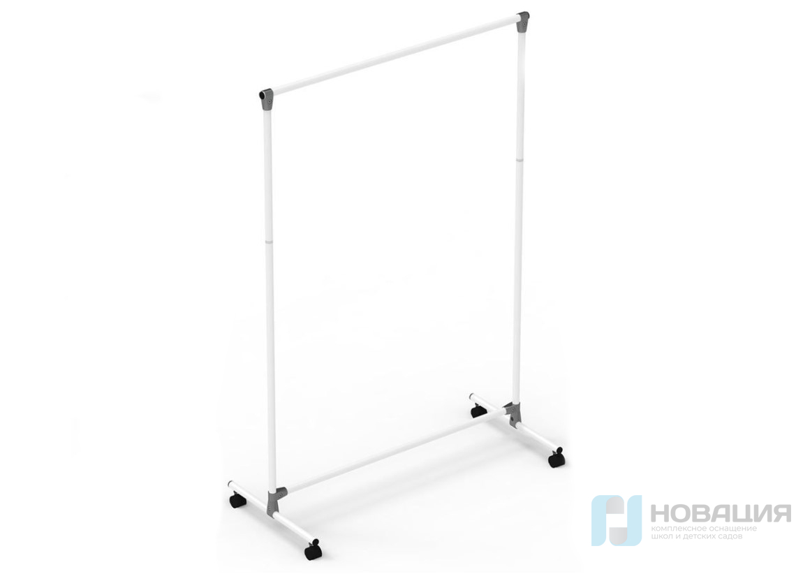 Стойка изготовлена из металлической трубы диаметром 25 мм с толщиной стенки 1 мм. Сверху нанесено порошково-полимерное покрытие. Оснащена колесами для удобного перемещения. Поставляется в разобранном виде.