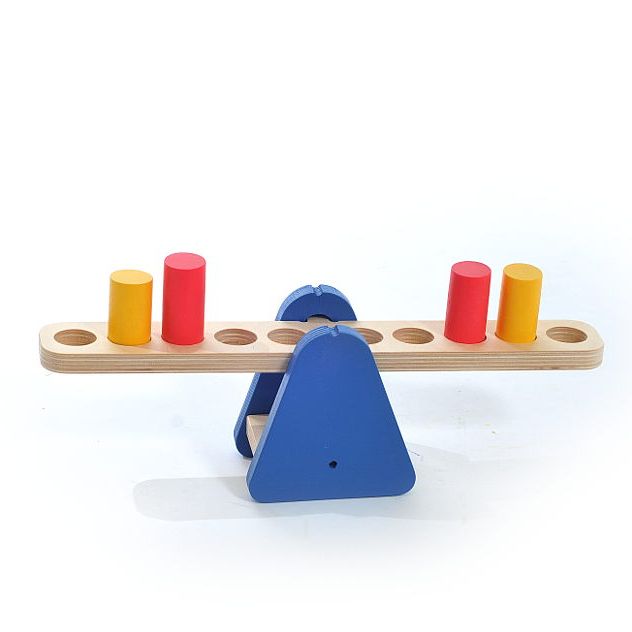 Детские весы представлены в виде рычага с лунками, закрепленного на подставке. В углубления вставляются цилиндрические грузы разных масс и цветов. Занятия с игрушечным прибором дают представление о физических законах.