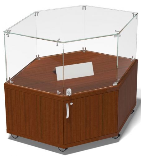 Корпус прилавка представлен закрытым отделением из ЛДСП и стеклянным отсеком (марка материала М1). Оба яруса дополнены одностворчатыми дверцами, запирающимися на замок.