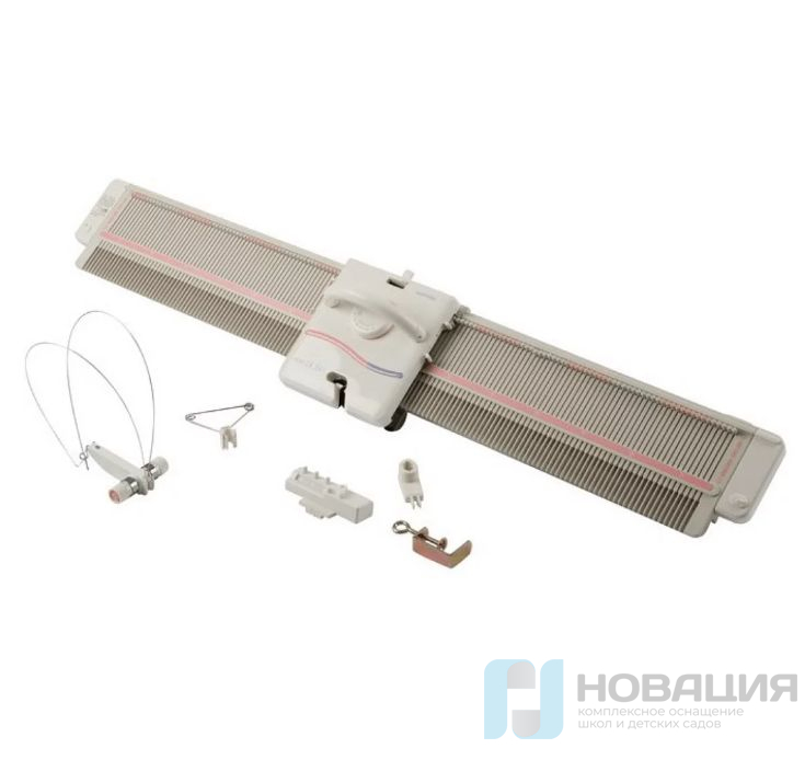 Вязальная машина для пряжи толщиной 200-500 м/100 гр оснащается 150-ю иглами (расстояние 6,5 мм). Игольница выполняется из пластмассы, подача ручная.