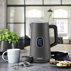 Чайник KITFORT КТ-6115-2, 1,5 л, 1800 Вт, закрытый нагревательный элемент, ТЕРМОРЕГУЛЯТОР, двойные стенки, серый