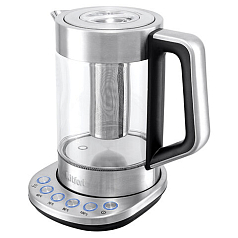 Чайник KITFORT КТ-622, 1,7 л, 2200 Вт, закрытый нагревательный элемент, ТЕРМОРЕГУЛЯТОР, заварник, стекло, серебро