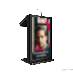 Встроенные микрофоны позволяют передавать звук на большую аудиторию. С помощью удобного интерактивного дисплея с мультитач-системой можно отображать необходимую информацию для спикера и для зрителей, передавая ее на большой экран. Также в трибуне предусмотрены полочка для воды и внешние разъемы.
