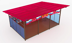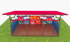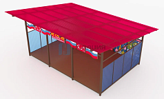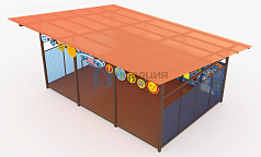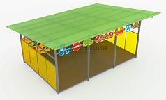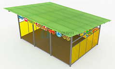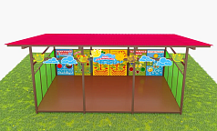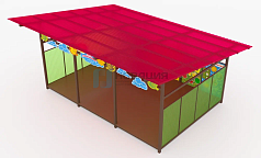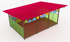 Пол выполнен из промышленной половой сухой доски, пропитанной антисептиком от влаги и гниения. Крыша из профнастила толщиной 0,45 мм защищает детей и взрослых от влияния различных погодных условий. По периметру веранды с 3 сторон устанавливается скамья шириной 250 мм.
