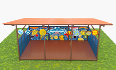 Пол выполнен из высушенной доски сосновых пород, пропитанной антисептиком от влаги и гниения. На крышу настилается профнастил. На ограждение из влагостойкой фанеры нанесен красочный рисунок.