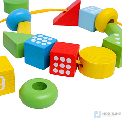 Набор состоит из ярких деталей разной формы и шнурка с удобной деревянной палочкой-иглой. Игра развивает мелкую моторику и координацию движений, тренирует логику и внимание, помогает изучать геометрические фигуры, цвета и цифры.