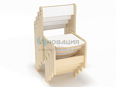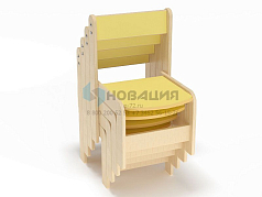 Детский стул стоит на 4-х ножках. 2 задние опоры переходят в полозья, 2 передние укреплены перекладиной. Спинка прямоугольная. Края передней стороны сиденья скруглены. Мебель без острых углов штабелируются.