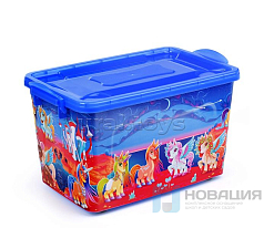 Цветной контейнер для игрушек и бытовых предметов имеет прямоугольное основание, высокие стенки 2-мя боковыми ручками, крышку с ручкой. Одна сторона корзинки украшена принтом.