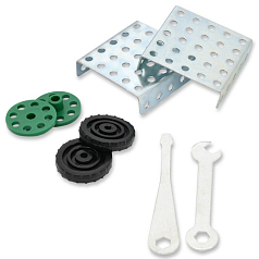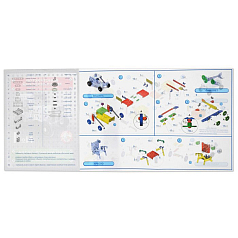 В наборе косынки, колеса, скобы, ключи, пластины. Приводится схема сборки 5-ти моделей (машина, самолет, коляска, велосипед, вертолет).