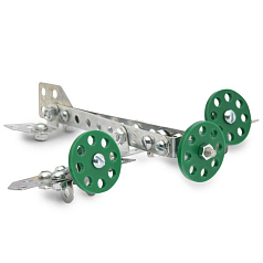 В наборе колеса, планки, ключи, скобы. Приводится схема сборки 5-ти моделей (2-х машинок, велосипеда, самолета, кресла).