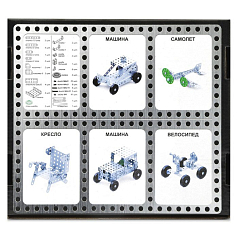 В наборе планки, пластины, косынки. Приводится схема сборки 5-ти моделей (машина, коляска, самолет, велосипед, вертолет).