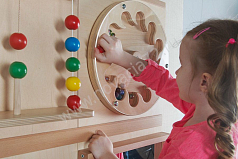 Настенная панель представляет собой деревянный корпус, к которому прикреплены различные тактильные предметы и материалы: ковровые и алюминиевые покрытия, деревянные полусферы и плоские геометрические фигуры, зеркальные панели. Способствует развитию тактильного, визуального и акустического восприятия, осязательных навыков.