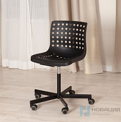 Мебель дополняется подлокотниками из пластика, спинка и сиденье обтянуты тканью-сеткой. Высота кресла изменяется, пятилучье (d=640 мм) оборудуется роликами с покрытием из полиуретана.