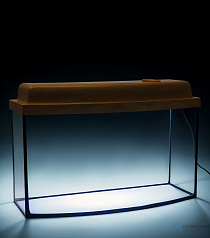 Аквариум "телевизор" обеспечивает обзор 180°. Крышка с подсветкой защищает от испарений и пыли. Конструкция герметична, ее классический дизайн впишется в интерьер уголка природы, кабинета биологии или сенсорной комнаты.