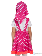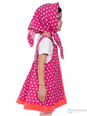 Костюм для девочки включает сарафан и косынку. Украшен принтом в горошек. Бретели сарафана регулируются. Подходит для проведения спектаклей, сценок и костюмированных представлений.