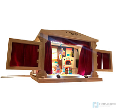 Сцена вращается, занавес открывается и закрывается механически. Руки актеров скрываются за подвижными ширмами. Спектакль сопровождается мелодией из шкатулки. Предусмотрено 2 вида подсветки: верхняя и фронтальная. Включение, выключение и уровень яркости настраиваются поворотом круглого элемента в переднем левом углу конструкции.