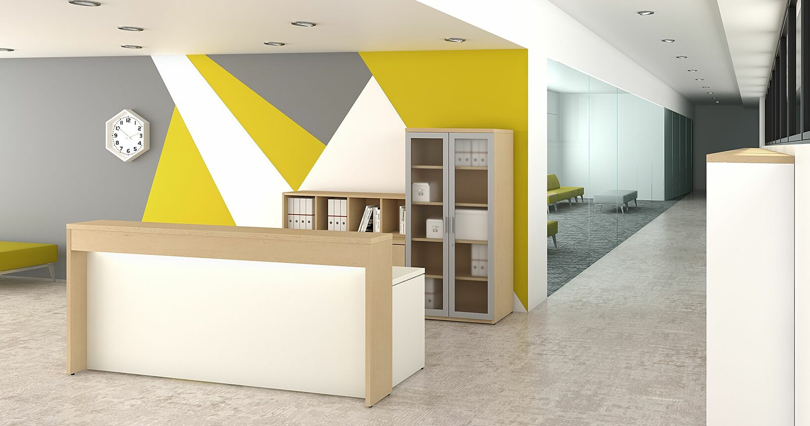 Мебельный комплекс для администратора состоит из 4-х прямых модулей, 2-х угловых модулей, 4-х накладок, 3-х металлических опор, 2-х боковин. Опоры стойки ресепшн регулируются по высоте, возможна прокладка кабеля внутри.