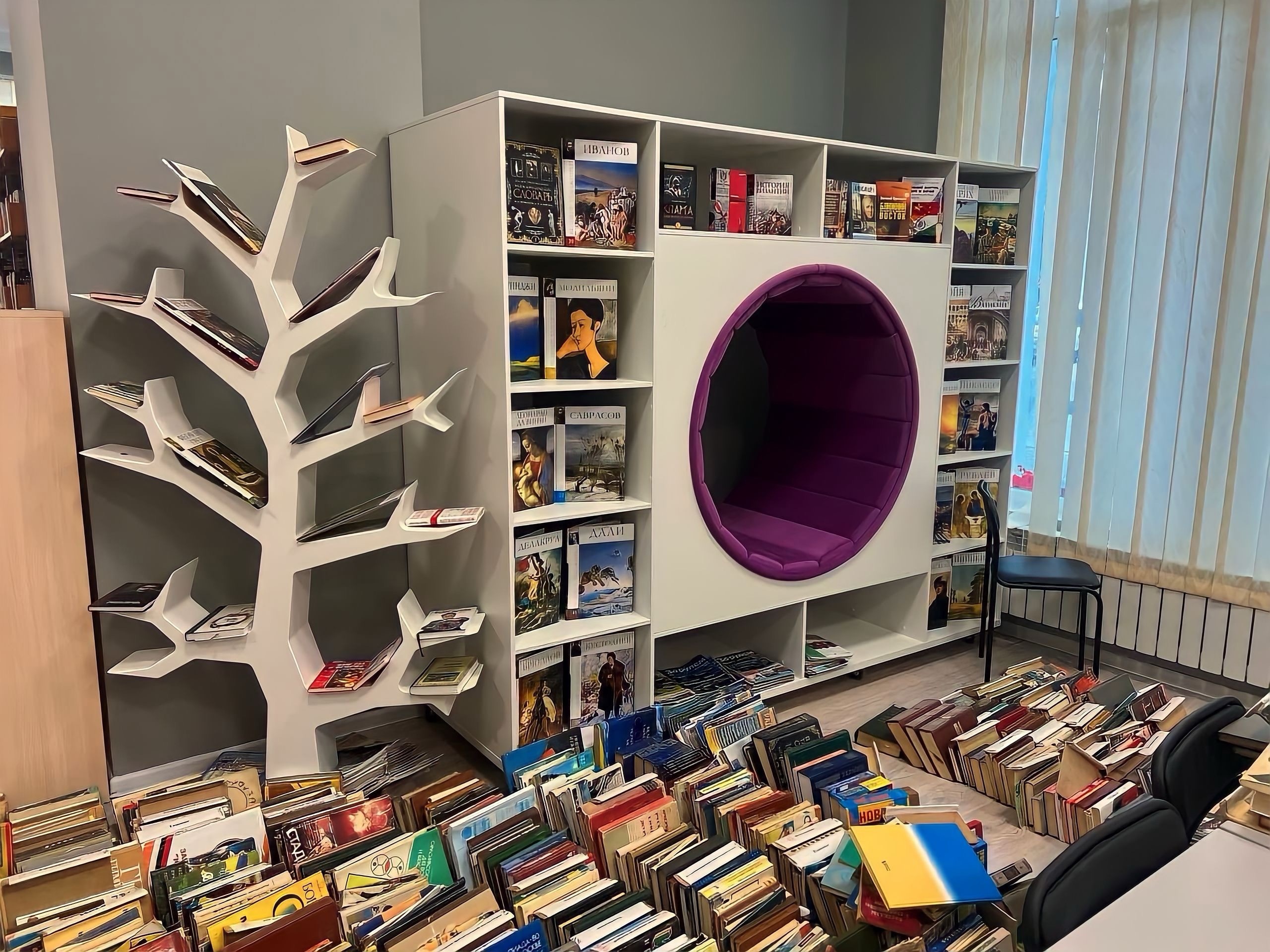 Книжные стеллажи, столы, стулья и мягкие модули от "Новации" для Министерства культуры, спорта и туризма ЗО.