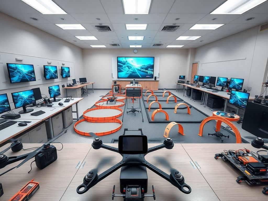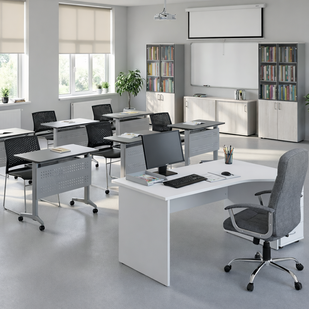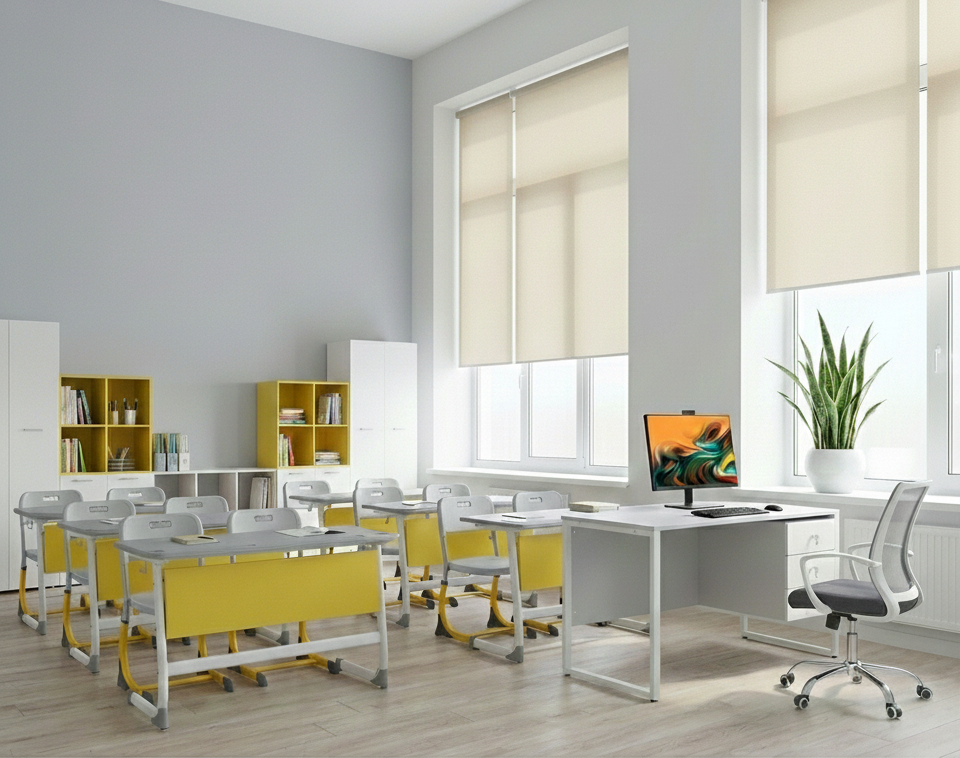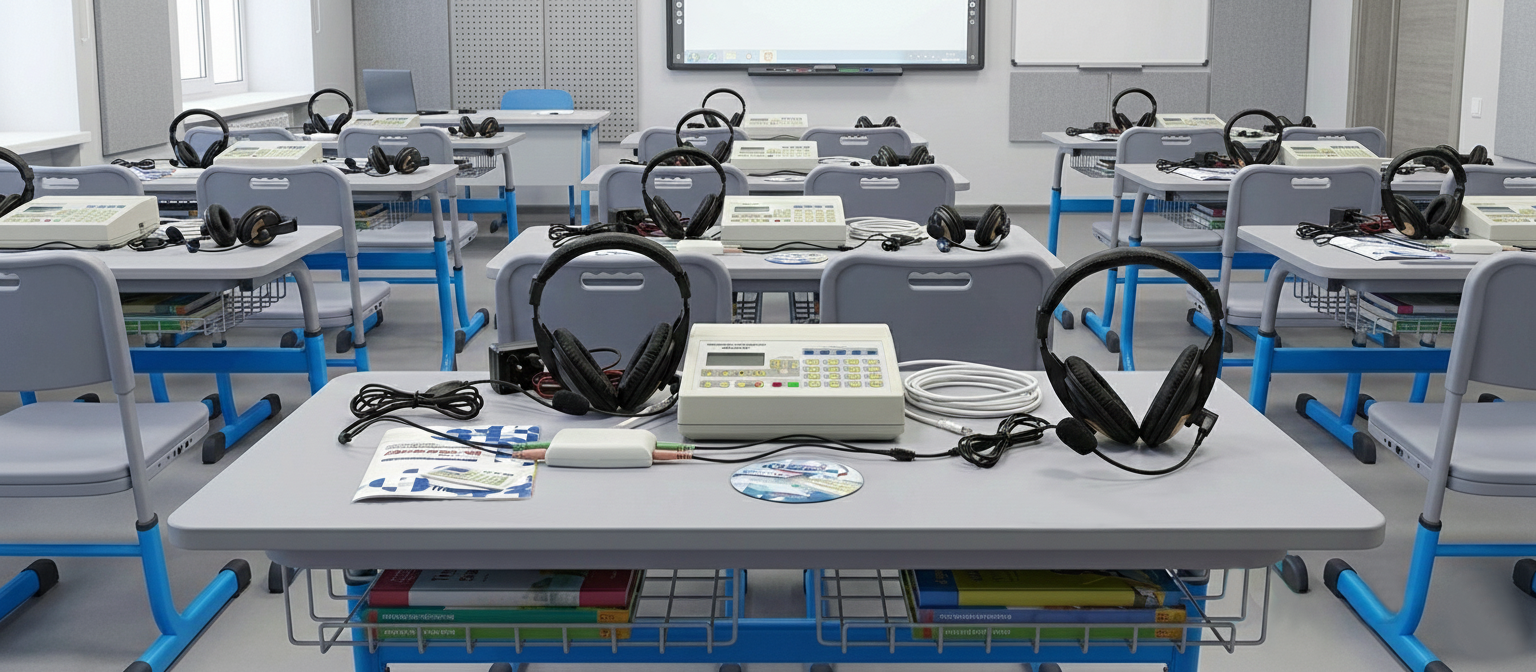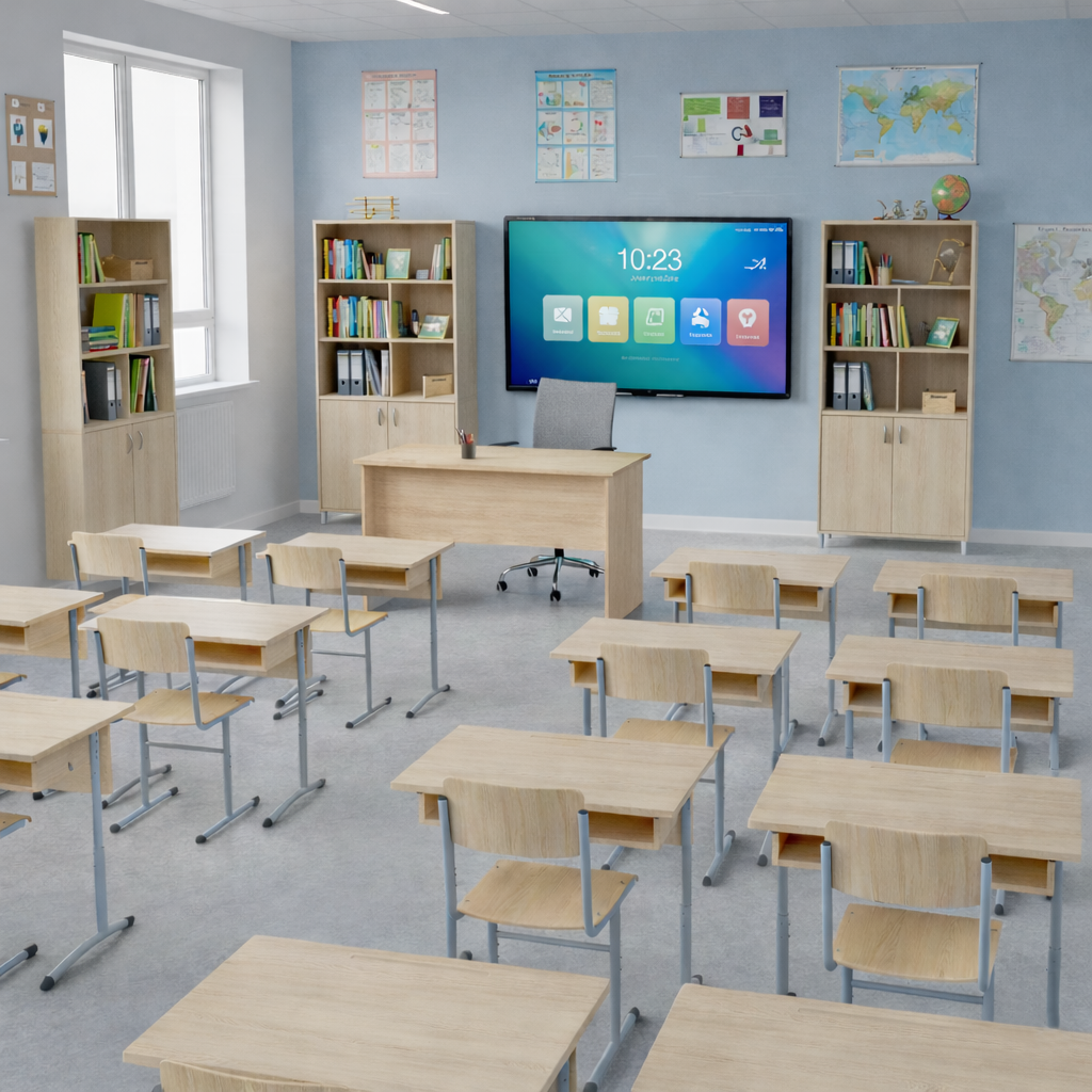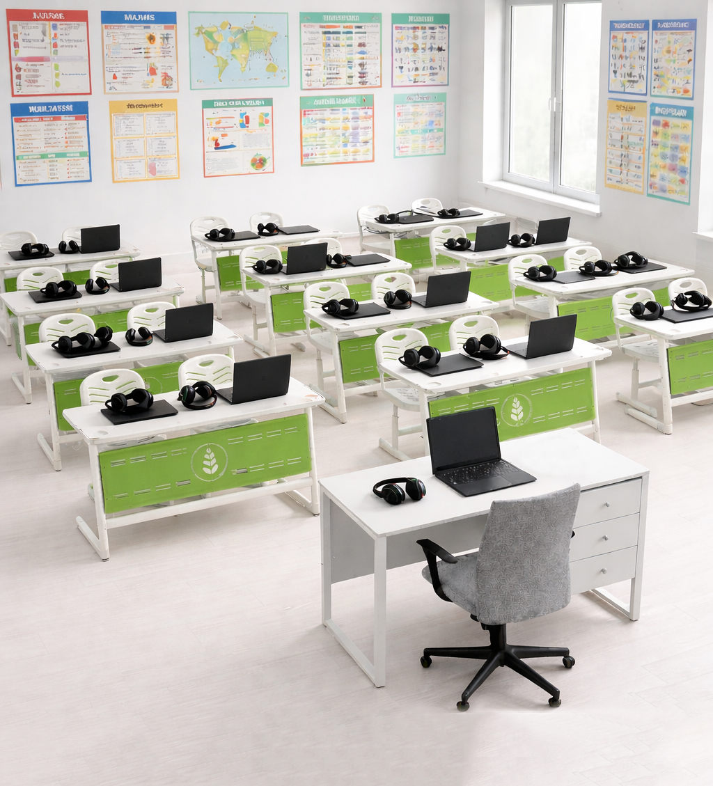 Пространство организовано с учётом эргономики и образовательных стандартов, включает индивидуальные рабочие места для учеников и зону преподавателя с централизованным управлением.