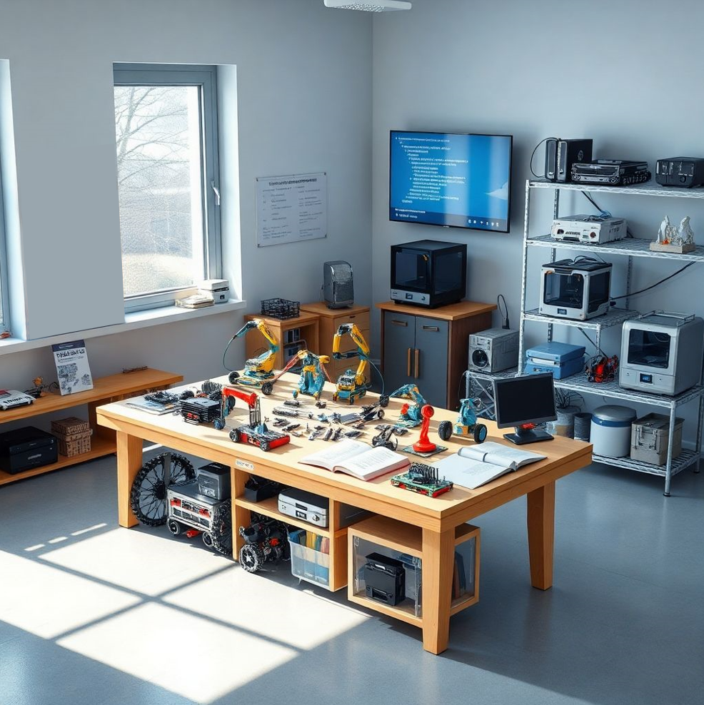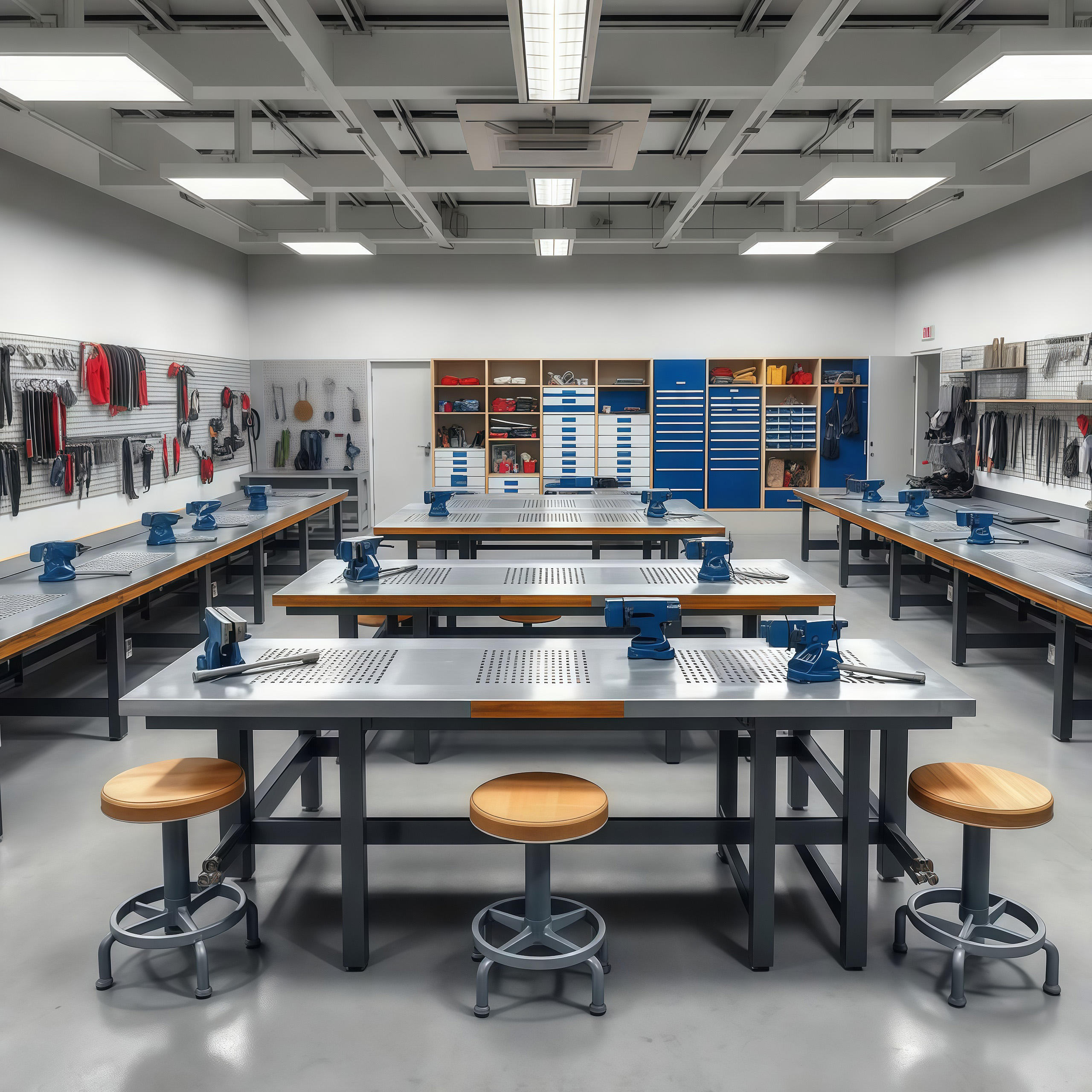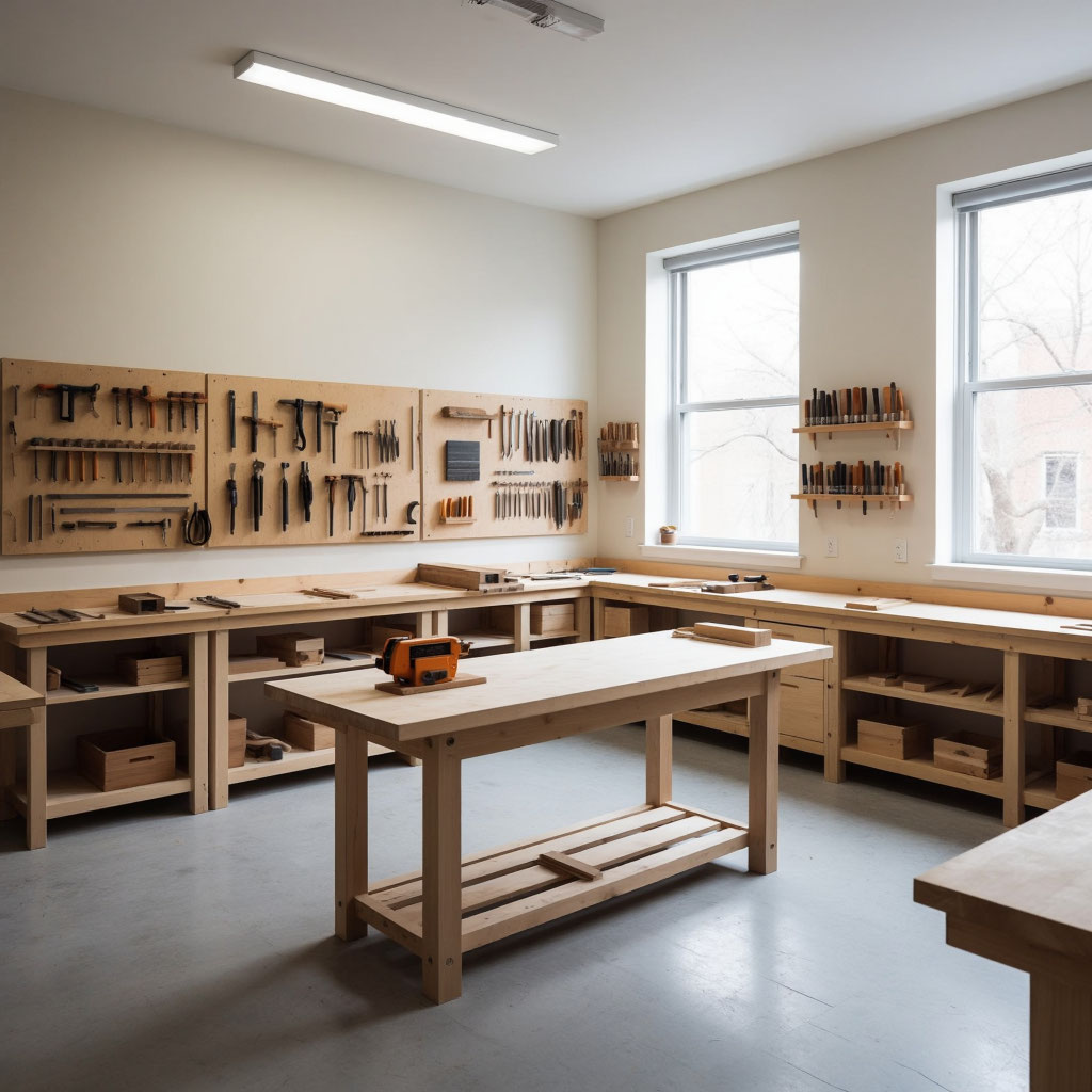 Планировочное решение предусматривает функциональное зонирование на учебную, рабочую и демонстрационную зоны с размещением верстаков, оборудования и мест хранения инструментов. Эргономичная мебель и понятная организация пространства создают комфортную и безопасную среду для обучения и практической работы учащихся.
