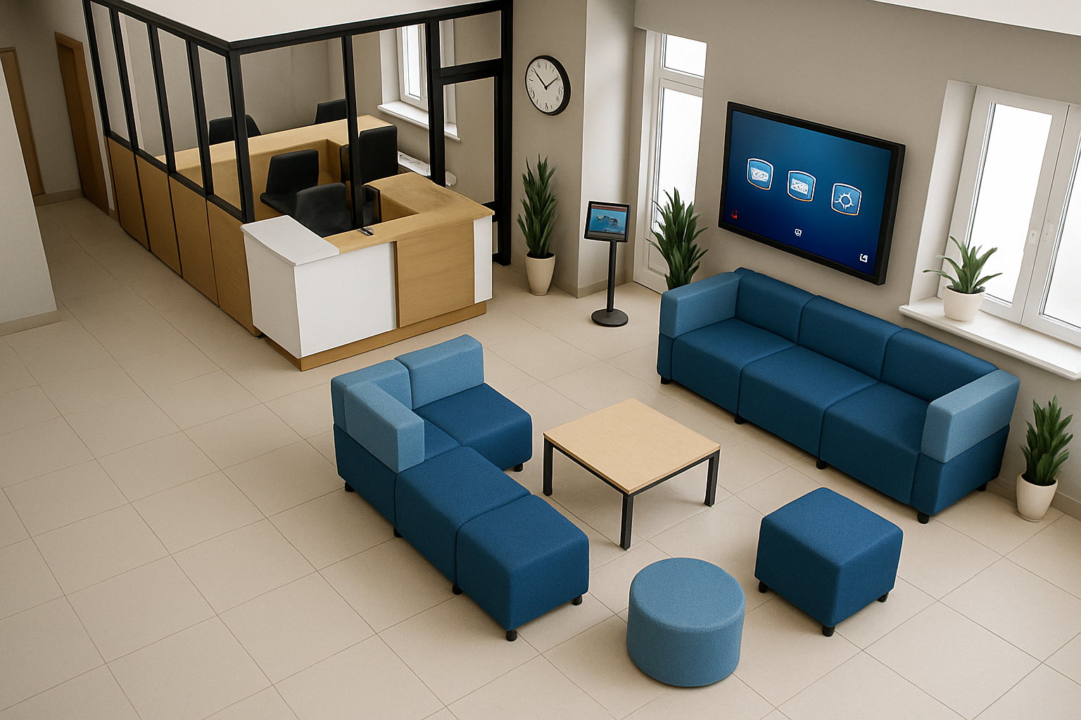Стильная входная зона общежития сочетает в себе комфорт, функциональность и современный дизайн. Модульная мягкая мебель формирует удобное пространство для ожидания, а оснащённая зона ресепшн обеспечивает оперативную коммуникацию с персоналом.