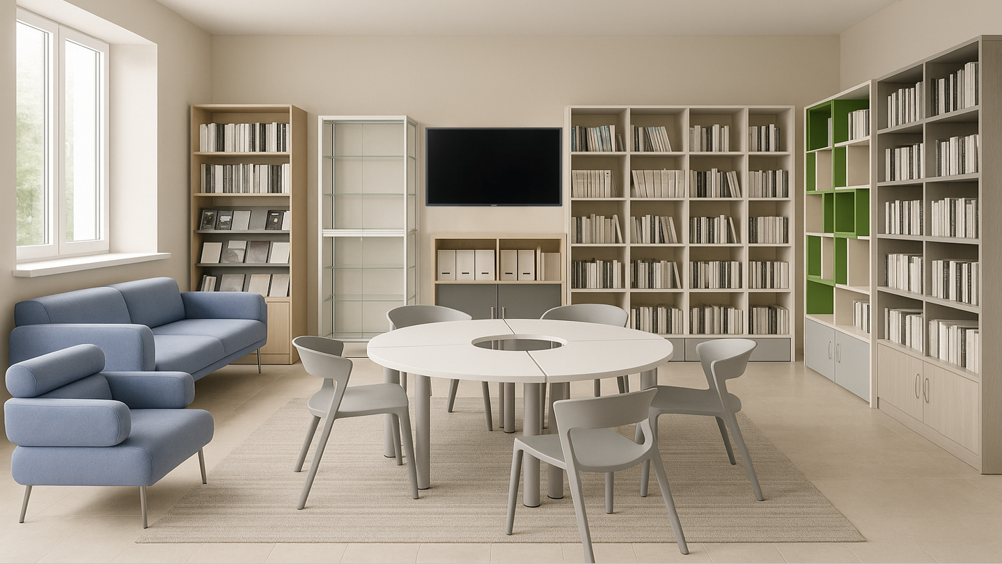 Современная зона для чтения и отдыха, оснащённая удобной мебелью и функциональными стеллажами для хранения литературы.